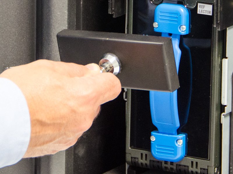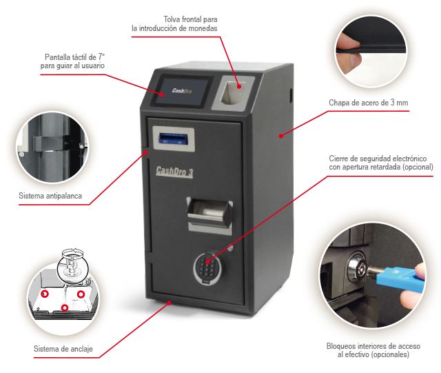 | Cierre electrónico con apertura retardada Sistema anti-palanca Sistema de anclaje en mostrador |