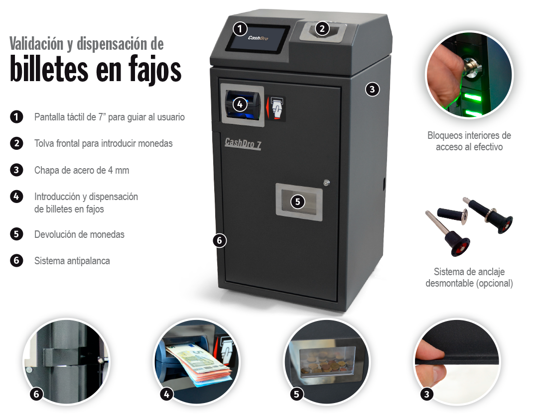 | Acepta, valida y dispensa billetes de 5€ a 500€ Carga y validación de billetes Velocidad validación de billetes Devolución de billetes |